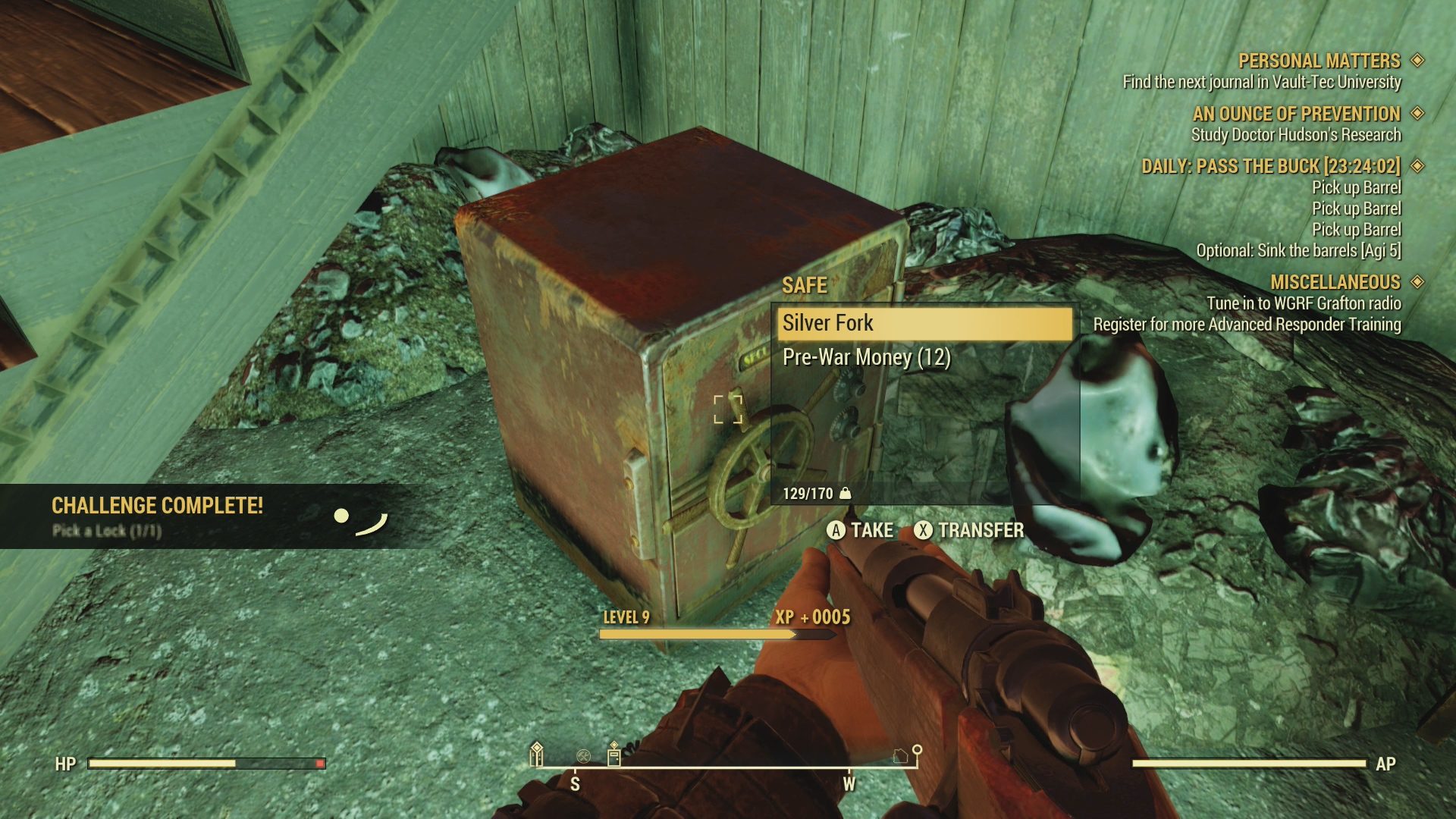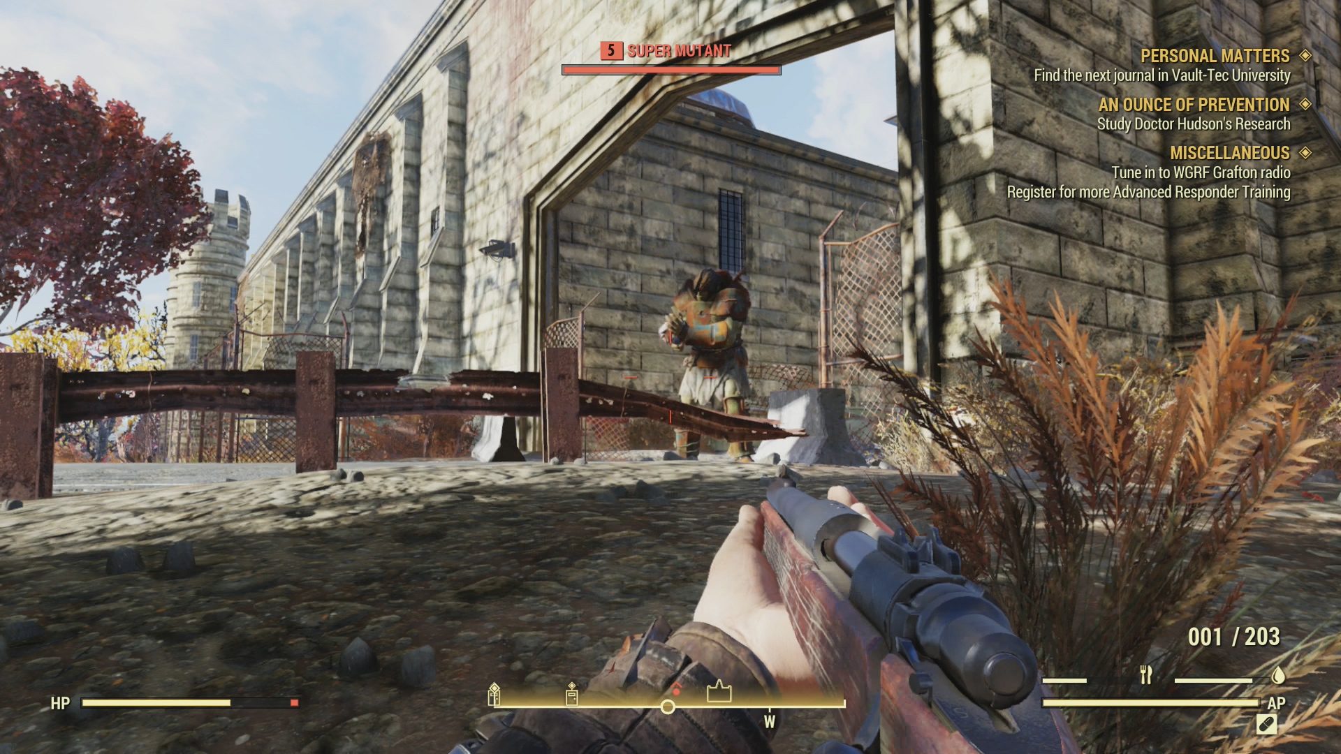 El juego te recompensa cuando desarmas armas y armaduras, otorgando modificaciones para obtener unas nuevas y mejores. Encontrarás recetas y guías en casas abandonadas, y terminales con entradas que brindan información útil que de otra manera no sabrías. Puedes pasar horas recolectando recursos a través de West Virginia.