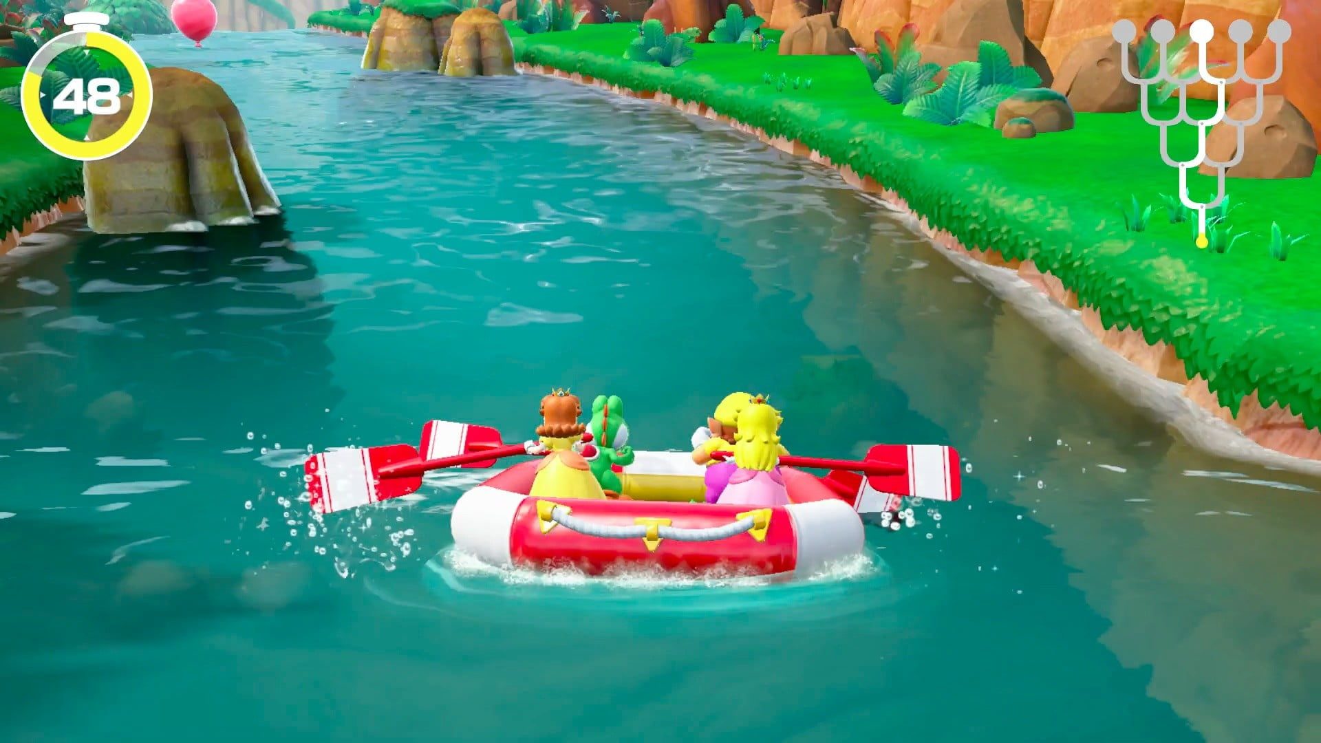 Sound Stage y River Survival, los otros dos modos, son divertidos para dar una vuelta o dos, pero se sienten rezagados. River Survival es una aventura cooperativa para cuatro jugadores donde tu equipo corre contra el reloj usando los controles de movimiento para remar en un río. Los globos que saltan te permiten jugar minijuegos que agregan más segundos al reloj. Es difícil fracasar en River Survival, y por eso, probablemente no te interesará por mucho tiempo a menos que estés jugando con niños pequeños.