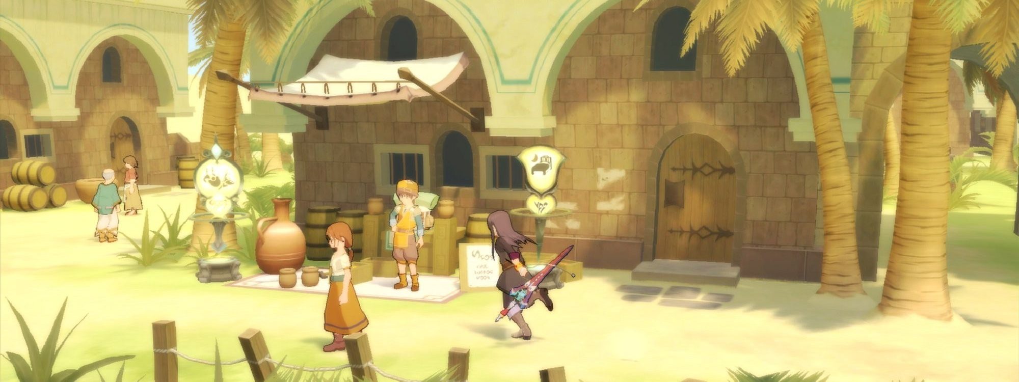 Luego de ese primer conflicto, el juego nos lleva a recorrer distintas ciudades y puntos de interés separados en regiones, por las que podemos caminar libremente con la costumbre del género de encontrar batallas emergentes cada 10 pasos. Cada vez que entremos a un sub espacio, nos esperarán docenas de NPCs con los que interactuar, algunos incluso ofreciendo misiones secundarias, además de tiendas en las que podemos comprar y vender equipamiento, así como forjar el propio si tenemos los materiales necesarios.