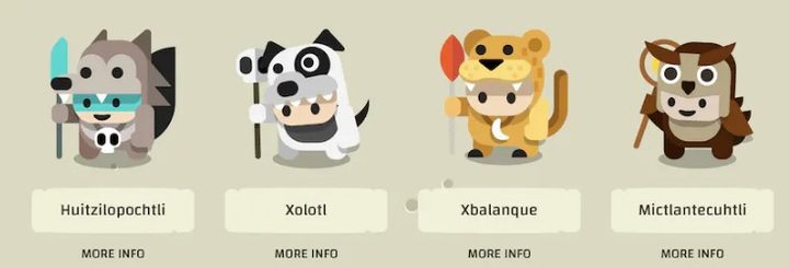 Podrás elegir entre uno de los cuatro adorables “disfraces” de animales para tus personajes que tienen raíces en la cultura mesoamericana. Elegí Huitzilopochtli, representado por el lobo, pero también puedes jugar como Xolotl (el perro), Xbalanque (el jaguar) y Mictlantecuhtli (el búho).